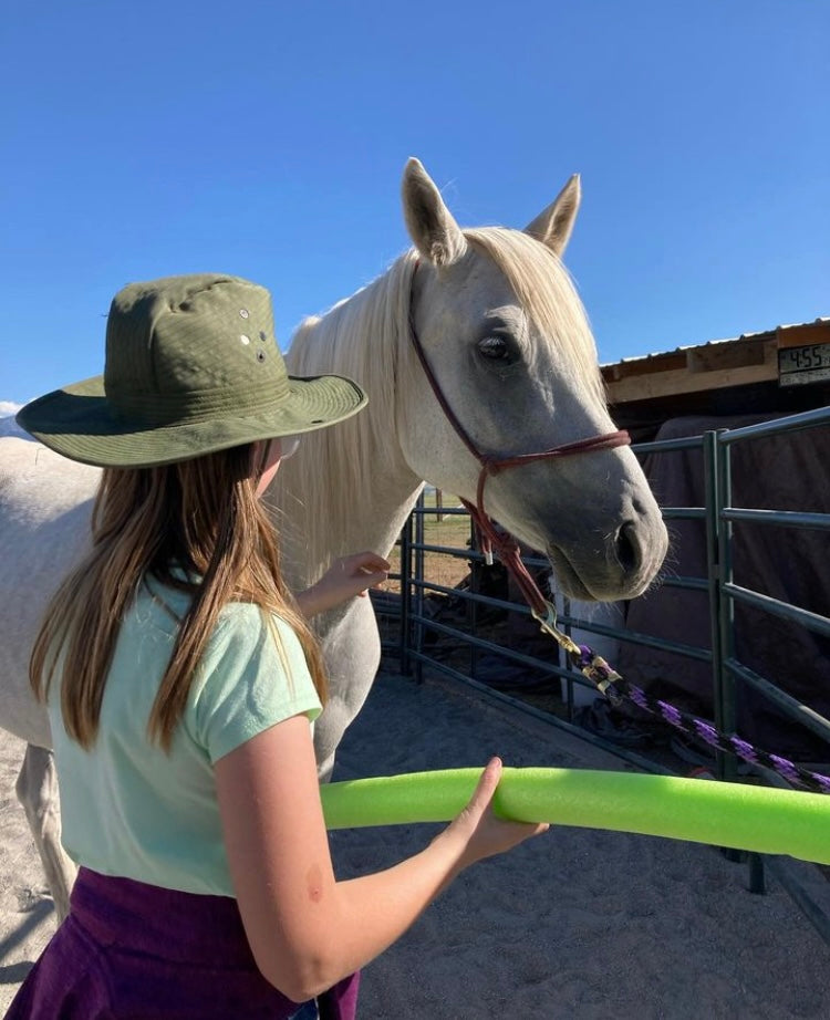 In this course students get the hands-on experience of participating in the behind the scenes of training and desensitizing baby and young horses. We use brushes, pool noodles, balls, flags, ropes, water, treats, and obstacles to teach tolerance and trust. Students also get to learn how to rope a steer head and compete in a mini-roping competition in the final class!